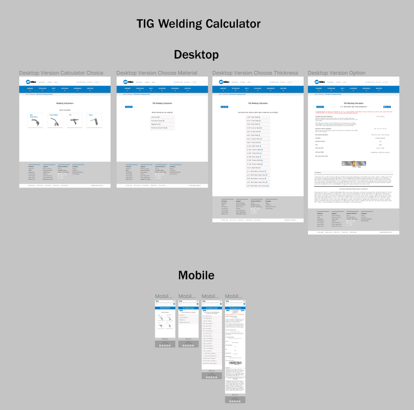 At the time Miller Welds reached out, their welding calculator was i-framed onto the page and was using flash. Miller Welds and many of users of the welding calculator noted that the old version of the calculator was sometimes sluggish, felt old, and in general needed a refined experience. Additionally, there were multiple calculators (for different applications) in which the client hoped to combine. It was also important to consider that flash was being phased out by all web browsers. Therefore, it was essential for Miller to update the welding calculator so that it would be compatible and future proof. Along that way, that meant that a refresh of the user experience and UI would be necessary.